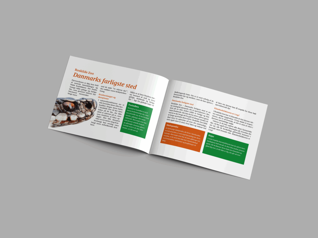 Jeg valgte at bruge farverne grøn og orange konsekvent, fordi de både matcher Roskilde Zoos identitet og giver et venligt udtryk, der tiltaler børnefamilier. For at sikre en pæn spalteopsætning brugte jeg de angivne hyphenation- og justification-indstillinger, hvilket gjorde teksten let at læse og visuelt harmonisk.